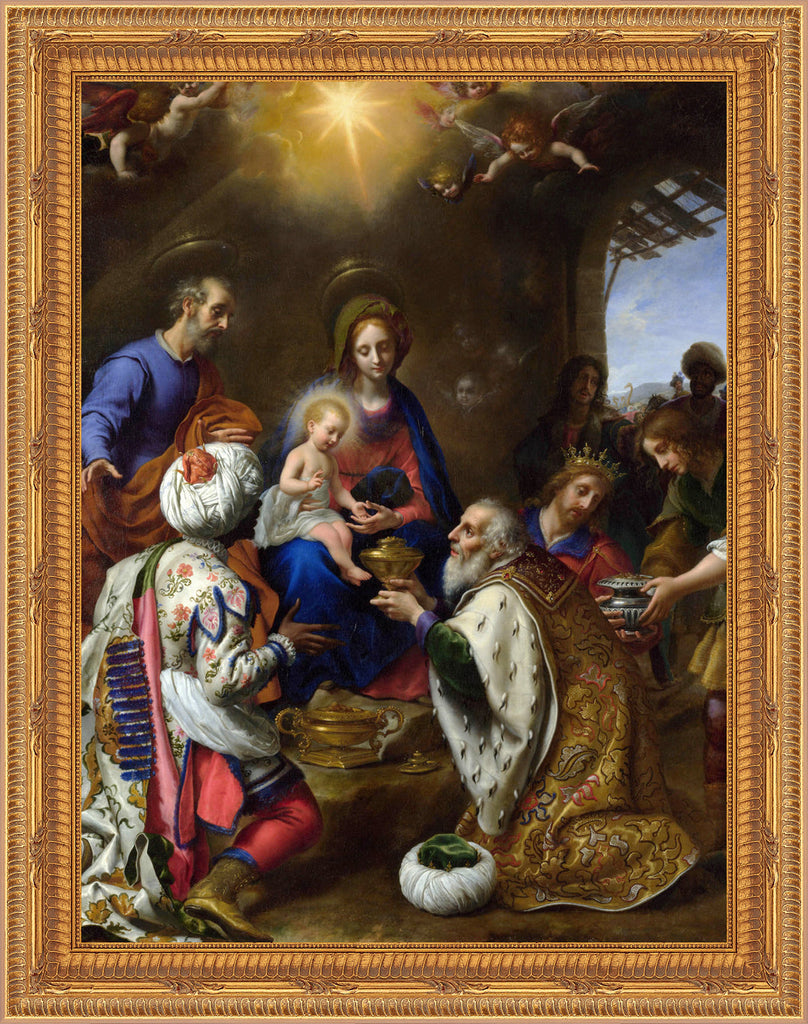 TEX-9300 Beautiful framed image of the Adoration of the Kings from the "Textures" collection by Royal Art & Design. What are "Textures"? "Textures" are high resolution images printed in eight colors on fine art paper. The look is a bright, crisp image with a watercolor elegance and a three-dimensional look. Mounted on hardboard and custom framed with a gold colored frame. Frame is 16" X 19", and the image itself varies from 8"-11" x 11"-14" depending on the image. Artist: Carlo Dolci
