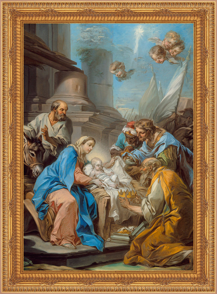 TEX-91009 Beautiful framed image of the Adoration of the Magi from the "Textures" collection by Royal Art & Design. What are "Textures"? "Textures" are high resolution images printed in eight colors on fine art paper. The look is a bright, crisp image with a watercolor elegance and a three-dimensional look. Mounted on hardboard and custom framed with a gold colored frame. Frame is 16" X 19", and the image itself varies from 8"-11" x 11"-14" depending on the image. Artist: Charles-André van Loo