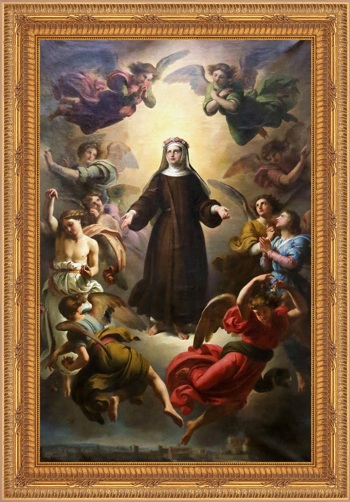 TEX-91163 Beautiful framed image of the Apothesis of Santa Rosa from the "Textures" collection by Royal Art & Design. What are "Textures"? "Textures" are high resolution images printed in eight colors on fine art paper. The look is a bright, crisp image with a watercolor elegance and a three-dimensional look. Mounted on hardboard and custom framed with a gold colored frame. Frame is 16" X 19", and the image itself varies from 8"-11" x 11"-14" depending on the image. Artist: Francesco Podesti