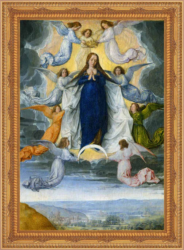 TEX-9227 Beautiful framed image of the Assumption of the Virgin from the "Textures" collection by Royal Art & Design. What are "Textures"? "Textures" are high resolution images printed in eight colors on fine art paper. The look is a bright, crisp image with a watercolor elegance and a three-dimensional look. Mounted on hardboard and custom framed with a gold colored frame. Frame is 16" X 19", and the image itself varies from 8"-11" x 11"-14" depending on the image. Artist: Michel Sittow