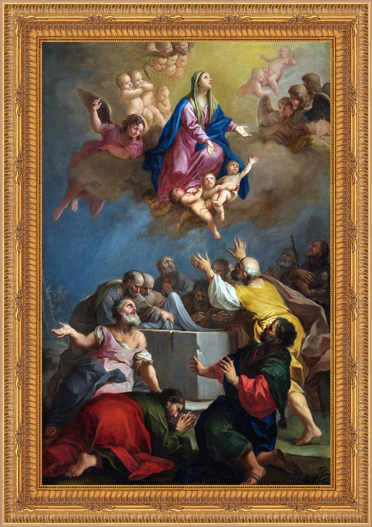 TEX-91252 Beautiful framed image of the Assumption of the Virgin from the "Textures" collection by Royal Art & Design. What are "Textures"? "Textures" are high resolution images printed in eight colors on fine art paper. The look is a bright, crisp image with a watercolor elegance and a three-dimensional look. Mounted on hardboard and custom framed with a gold colored frame. Frame is 16" X 19", and the image itself varies from 8"-11" x 11"-14" depending on the image. Artist: Jacopo Amigoni