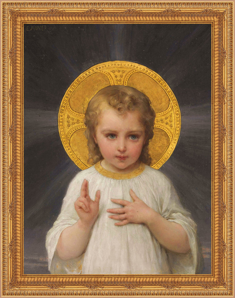 TEX-91177 Beautiful framed image of the Child Jesus from the "Textures" collection by Royal Art & Design. What are "Textures"? "Textures" are high resolution images printed in eight colors on fine art paper. The look is a bright, crisp image with a watercolor elegance and a three-dimensional look. Mounted on hardboard and custom framed with a gold colored frame. Frame is 16" X 19", and the image itself varies from 8"-11" x 11"-14" depending on the image. Artist: Emile Munier