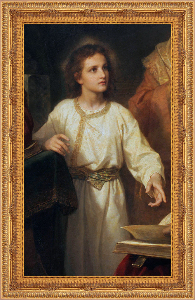 TEX-9722 Beautiful framed image of Christ Among the Doctors from the "Textures" collection by Royal Art & Design. What are "Textures"? "Textures" are high resolution images printed in eight colors on fine art paper. The look is a bright, crisp image with a watercolor elegance and a three-dimensional look. Mounted on hardboard and custom framed with a gold colored frame. Frame is 16" X 19", and the image itself varies from 8"-11" x 11"-14" depending on the image. Artist: Heinrich Hofmann