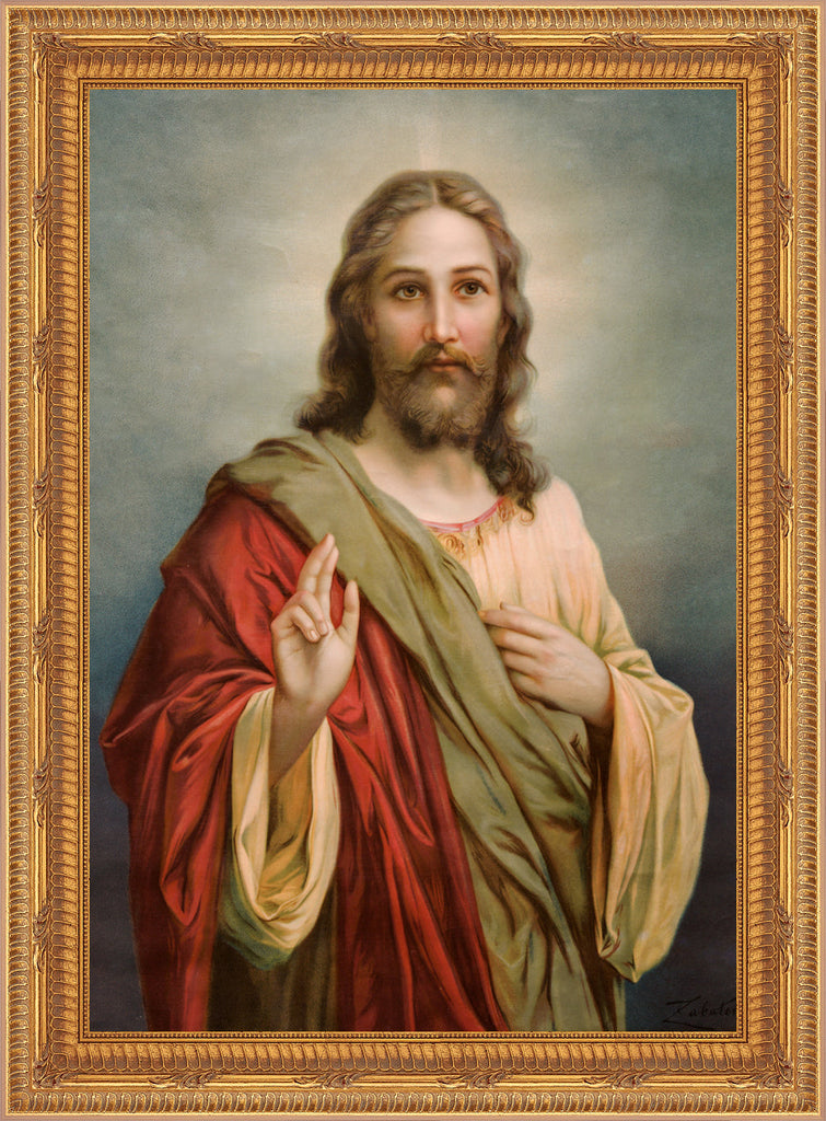 TEX-91030 Beautiful framed image of Christ Blessing from the "Textures" collection by Royal Art & Design. What are "Textures"? "Textures" are high resolution images printed in eight colors on fine art paper. The look is a bright, crisp image with a watercolor elegance and a three-dimensional look. Mounted on hardboard and custom framed with a gold colored frame. Frame is 16" X 19", and the image itself varies from 8"-11" x 11"-14" depending on the image. Artist: Zabateri