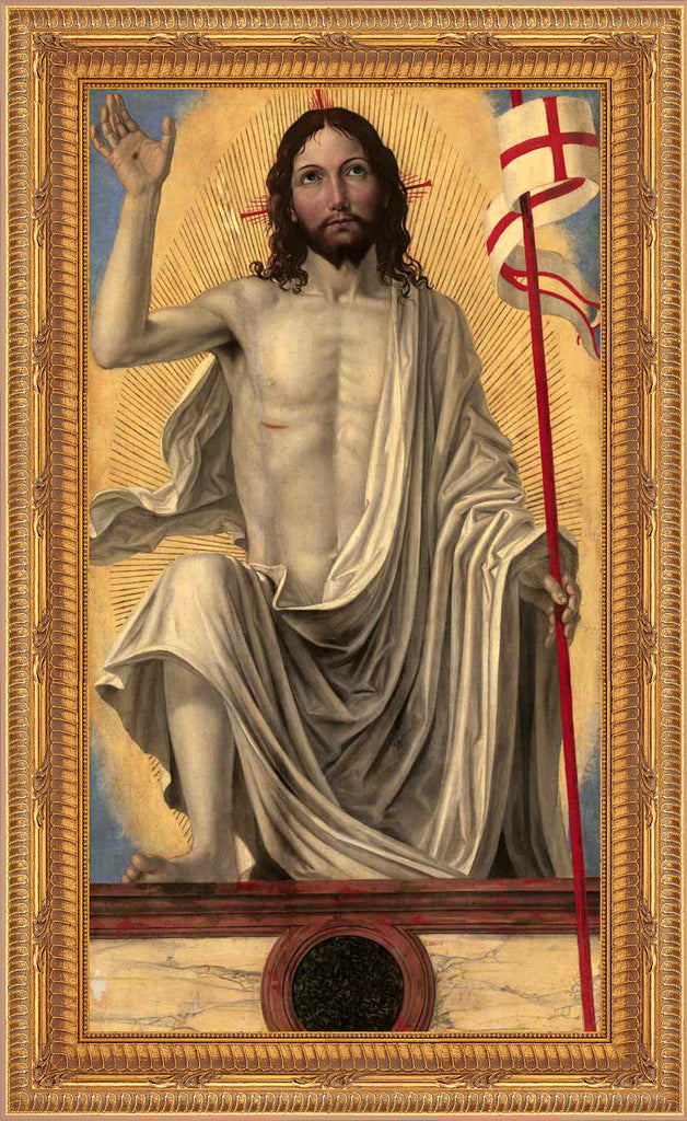 TEX-9207 Beautiful framed image of Christ Risen from the Tomb from the "Textures" collection by Royal Art & Design. What are "Textures"? "Textures" are high resolution images printed in eight colors on fine art paper. The look is a bright, crisp image with a watercolor elegance and a three-dimensional look. Mounted on hardboard and custom framed with a gold colored frame. Frame is 16" X 19", and the image itself varies from 8"-11" x 11"-14" depending on the image. Artist: Bergognone