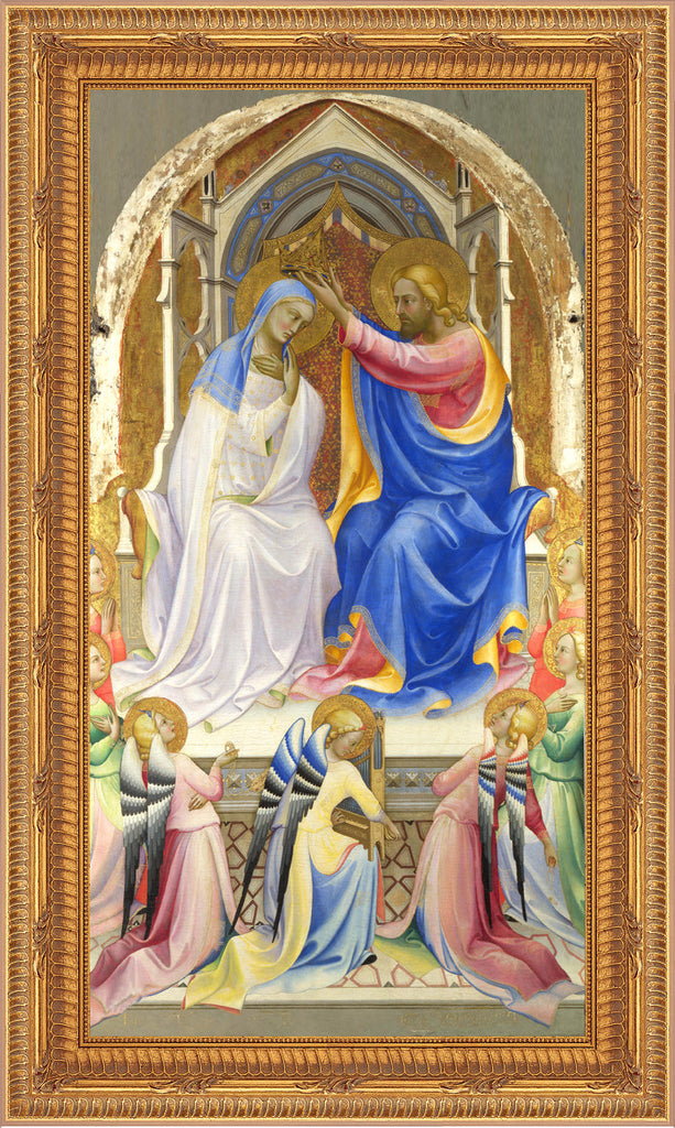 TEX-91110 Beautiful framed image of the Coronation of the Virgin from the "Textures" collection by Royal Art & Design. What are "Textures"? "Textures" are high resolution images printed in eight colors on fine art paper. The look is a bright, crisp image with a watercolor elegance and a three-dimensional look. Mounted on hardboard and custom framed with a gold colored frame. Frame is 16" X 19", and the image itself varies from 8"-11" x 11"-14" depending on the image. Artist: Lorenzo Monaco