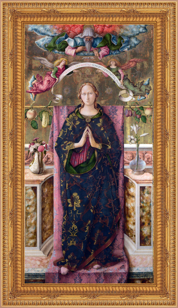 TEX-9814 Beautiful framed image of the Immaculate Conception from the "Textures" collection by Royal Art & Design. What are "Textures"? "Textures" are high resolution images printed in eight colors on fine art paper. The look is a bright, crisp image with a watercolor elegance and a three-dimensional look. Mounted on hardboard and custom framed with a gold colored frame. Frame is 16" X 19", and the image itself varies from 8"-11" x 11"-14" depending on the image. Artist: Carlo Crivelli