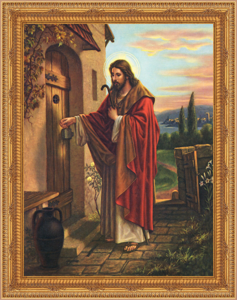 TEX-7014 Beautiful framed image of Jesus Knocking from the "Textures" collection by Royal Art & Design. What are "Textures"? "Textures" are high resolution images printed in eight colors on fine art paper. The look is a bright, crisp image with a watercolor elegance and a three-dimensional look. Mounted on hardboard and custom framed with a gold colored frame. Frame is 16" X 19", and the image itself varies from 8"-11" x 11"-14" depending on the image.