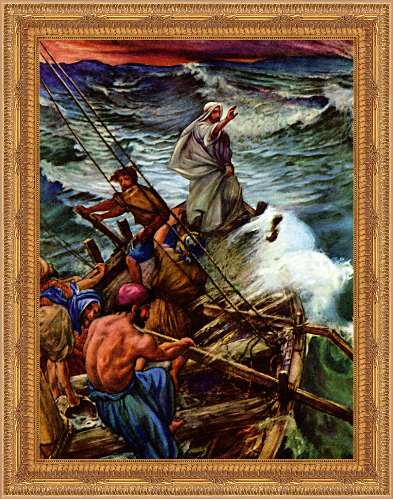 TEX-9897 Beautiful framed image of Jesus Stills the Tempest from the "Textures" collection by Royal Art & Design. What are "Textures"? "Textures" are high resolution images printed in eight colors on fine art paper. The look is a bright, crisp image with a watercolor elegance and a three-dimensional look. Mounted on hardboard and custom framed with a gold colored frame. Frame is 16" X 19", and the image itself varies from 8"-11" x 11"-14" depending on the image. Artist: William Hole