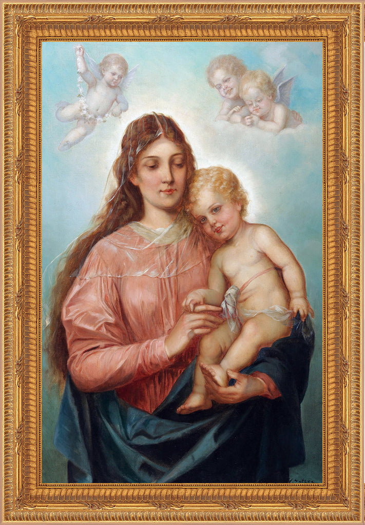 TEX-7034 Beautiful framed image of the Madonna & Child from the "Textures" collection by Royal Art & Design. What are "Textures"? "Textures" are high resolution images printed in eight colors on fine art paper. The look is a bright, crisp image with a watercolor elegance and a three-dimensional look. Mounted on hardboard and custom framed with a gold colored frame. Frame is 16" X 19", and the image itself varies from 8"-11" x 11"-14" depending on the image.