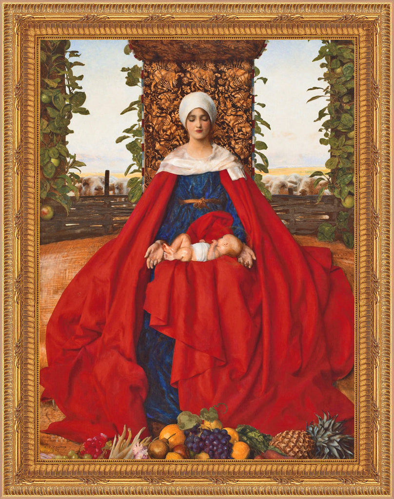 TEX-91214 Beautiful framed image of the Madonna of Fruits of the Earth from the "Textures" collection by Royal Art & Design. What are "Textures"? "Textures" are high resolution images printed in eight colors on fine art paper. The look is a bright, crisp image with a watercolor elegance and a three-dimensional look. Mounted on hardboard and custom framed with a gold colored frame. Frame is 16" X 19", and the image itself varies from 8"-11" x 11"-14" depending on the image. Artist: Frank Cadogan Cowper RA