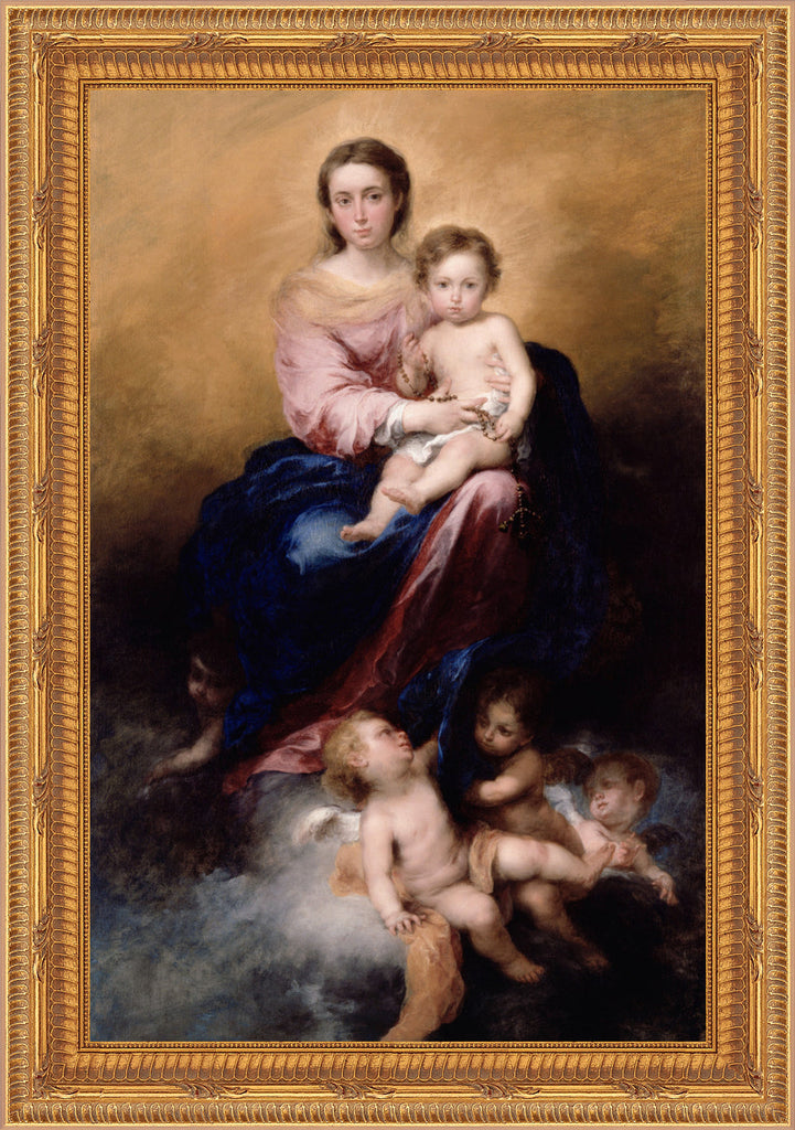 TEX-9545 Beautiful framed image of Madonna of the Rosary from the "Textures" collection by Royal Art & Design. What are "Textures"? "Textures" are high resolution images printed in eight colors on fine art paper. The look is a bright, crisp image with a watercolor elegance and a three-dimensional look. Mounted on hardboard and custom framed with a gold colored frame. Frame is 16" X 19", and the image itself varies from 8"-11" x 11"-14" depending on the image. Artist: Bartolomeo Esteban Murillo