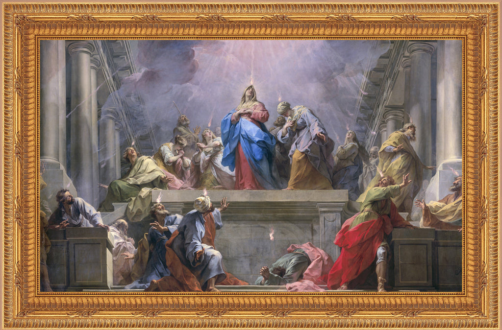 TEX-9003 Beautiful framed image of the Pentecost from the "Textures" collection by Royal Art & Design. What are "Textures"? "Textures" are high resolution images printed in eight colors on fine art paper. The look is a bright, crisp image with a watercolor elegance and a three-dimensional look. Mounted on hardboard and custom framed with a gold colored frame. Frame is 16" X 19", and the image itself varies from 8"-11" x 11"-14" depending on the image. Artist: Jean Restout II