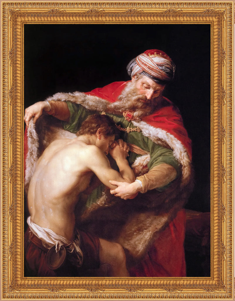 TEX-9632 Beautiful framed image of the Return of the Prodigal Son from the "Textures" collection by Royal Art & Design. What are "Textures"? "Textures" are high resolution images printed in eight colors on fine art paper. The look is a bright, crisp image with a watercolor elegance and a three-dimensional look. Mounted on hardboard and custom framed with a gold colored frame. Frame is 16" X 19", and the image itself varies from 8"-11" x 11"-14" depending on the image. Artist: Pompeo Batoni