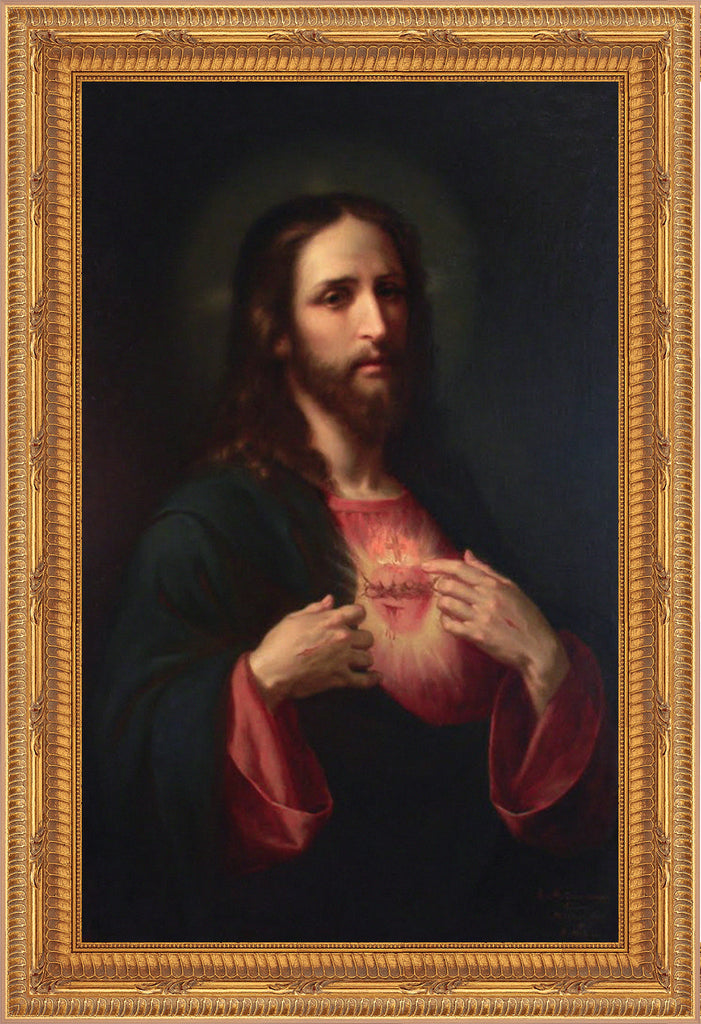 TEX-9849 Beautiful framed image of the Sacred Heart of Jesus from the "Textures" collection by Royal Art & Design. What are "Textures"? "Textures" are high resolution images printed in eight colors on fine art paper. The look is a bright, crisp image with a watercolor elegance and a three-dimensional look. Mounted on hardboard and custom framed with a gold colored frame. Frame is 16" X 19", and the image itself varies from 8"-11" x 11"-14" depending on the image. Artist: José Maria Ibarraran y Ponce