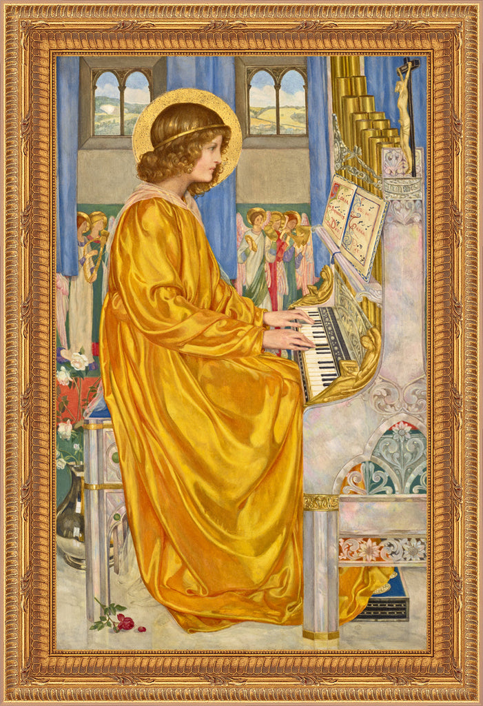 TEX-91455 Beautiful framed image of Saint Cecilia from the "Textures" collection by Royal Art & Design. What are "Textures"? "Textures" are high resolution images printed in eight colors on fine art paper. The look is a bright, crisp image with a watercolor elegance and a three-dimensional look. Mounted on hardboard and custom framed with a gold colored frame. Frame is 16" X 19", and the image itself varies from 8"-11" x 11"-14" depending on the image. Artist: Kate Elizabeth Bunce