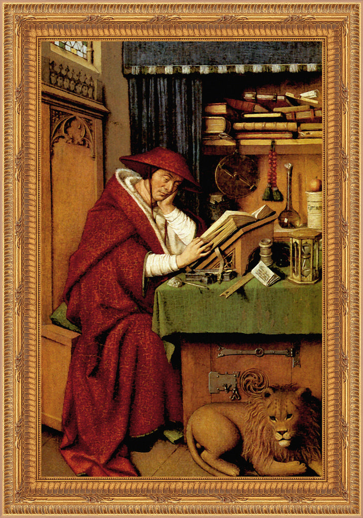 TEX-9687 Beautiful framed image of Saint Jerome in His Study from the "Textures" collection by Royal Art & Design. What are "Textures"? "Textures" are high resolution images printed in eight colors on fine art paper. The look is a bright, crisp image with a watercolor elegance and a three-dimensional look. Mounted on hardboard and custom framed with a gold colored frame. Frame is 16" X 19", and the image itself varies from 8"-11" x 11"-14" depending on the image. Artist: Jan van Eyck