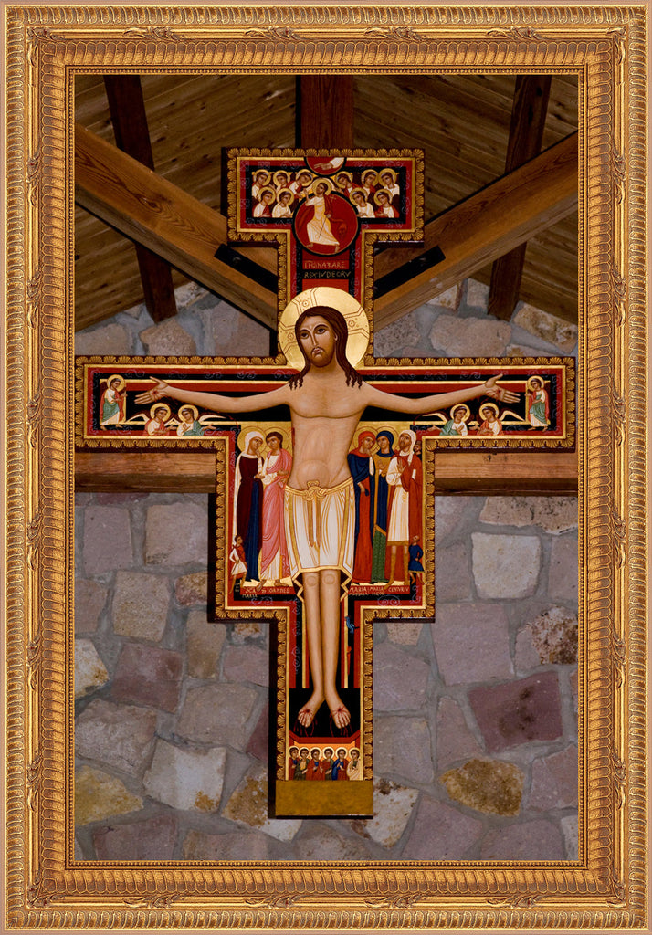 TEX-9902 Beautiful framed image of the San Damiano Cross from the "Textures" collection by Royal Art & Design. What are "Textures"? "Textures" are high resolution images printed in eight colors on fine art paper. The look is a bright, crisp image with a watercolor elegance and a three-dimensional look. Mounted on hardboard and custom framed with a gold colored frame. Frame is 16" X 19", and the image itself varies from 8"-11" x 11"-14" depending on the image. Artist: Unknown