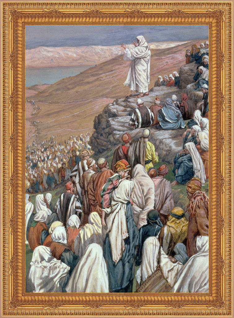TEX-91021 Beautiful framed image of the Sermon on the Mount from the "Textures" collection by Royal Art & Design. What are "Textures"? "Textures" are high resolution images printed in eight colors on fine art paper. The look is a bright, crisp image with a watercolor elegance and a three-dimensional look. Mounted on hardboard and custom framed with a gold colored frame. Frame is 16" X 19", and the image itself varies from 8"-11" x 11"-14" depending on the image. Artist: James Tissot