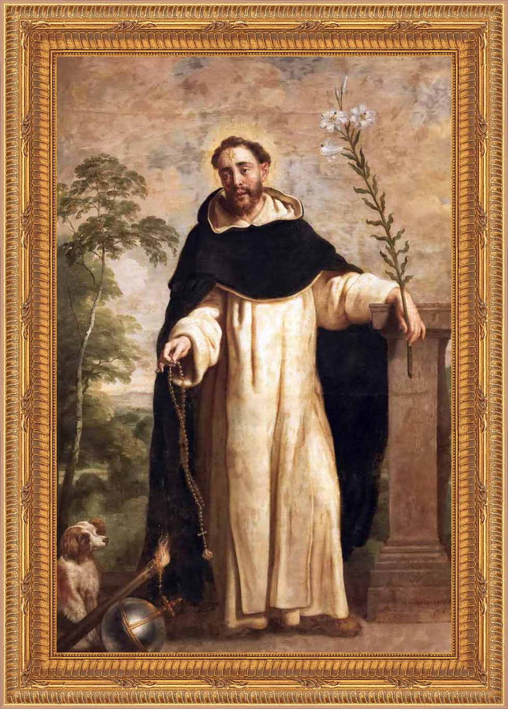 TEX-9126 Beautiful framed image of Saint Domenic of Guzman from the "Textures" collection by Royal Art & Design. What are "Textures"? "Textures" are high resolution images printed in eight colors on fine art paper. The look is a bright, crisp image with a watercolor elegance and a three-dimensional look. Mounted on hardboard and custom framed with a gold colored frame. Frame is 16" X 19", and the image itself varies from 8"-11" x 11"-14" depending on the image. Artist: Gaspar de Crayer
