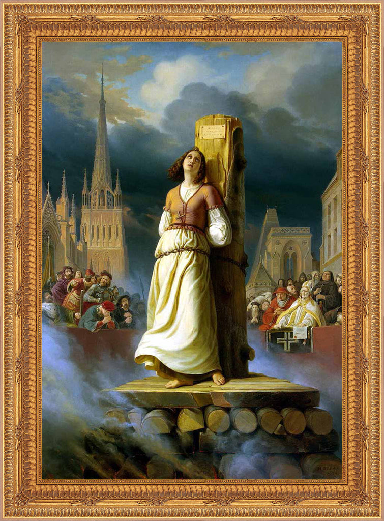 TEX-9202 Beautiful framed image of Saint Joan of Arc at the Stake from the "Textures" collection by Royal Art & Design. What are "Textures"? "Textures" are high resolution images printed in eight colors on fine art paper. The look is a bright, crisp image with a watercolor elegance and a three-dimensional look. Mounted on hardboard and custom framed with a gold colored frame. Frame is 16" X 19", and the image itself varies from 8"-11" x 11"-14" depending on the image. Artist: Herman Anton Shtilke