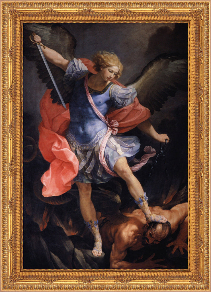TEX-9009 Beautiful framed image of Saint Michael the Archangel from the "Textures" collection by Royal Art & Design. What are "Textures"? "Textures" are high resolution images printed in eight colors on fine art paper. The look is a bright, crisp image with a watercolor elegance and a three-dimensional look. Mounted on hardboard and custom framed with a gold colored frame. Frame is 16" X 19", and the image itself varies from 8"-11" x 11"-14" depending on the image. Artist: Guido Reni