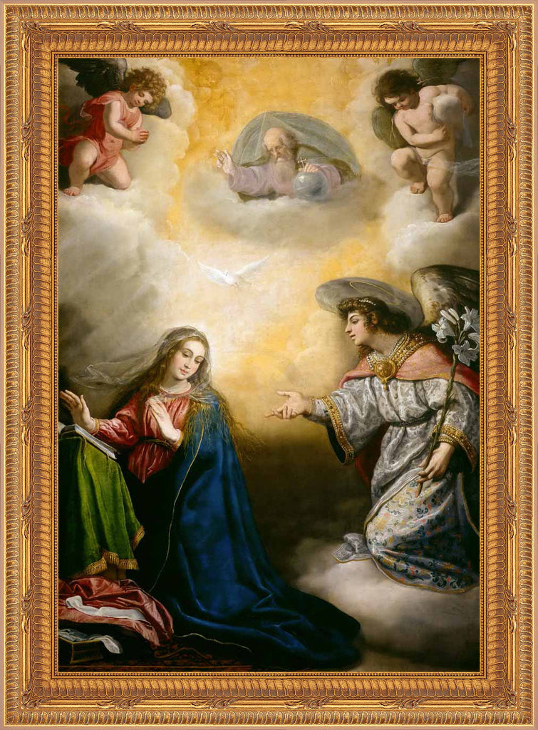 TEX-9155 Beautiful framed image of the Annunciation from the "Textures" collection by Royal Art & Design. What are "Textures"? "Textures" are high resolution images printed in eight colors on fine art paper. The look is a bright, crisp image with a watercolor elegance and a three-dimensional look. Mounted on hardboard and custom framed with a gold colored frame. Frame is 16" X 19", and the image itself varies from 8"-11" x 11"-14" depending on the image. Artist: Vicente Carducho