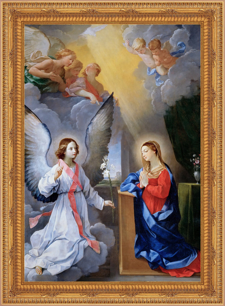 TEX-9609 Beautiful framed image of the Annunciation from the "Textures" collection by Royal Art & Design. What are "Textures"? "Textures" are high resolution images printed in eight colors on fine art paper. The look is a bright, crisp image with a watercolor elegance and a three-dimensional look. Mounted on hardboard and custom framed with a gold colored frame. Frame is 16" X 19", and the image itself varies from 8"-11" x 11"-14" depending on the image. Artist: Guido Reni