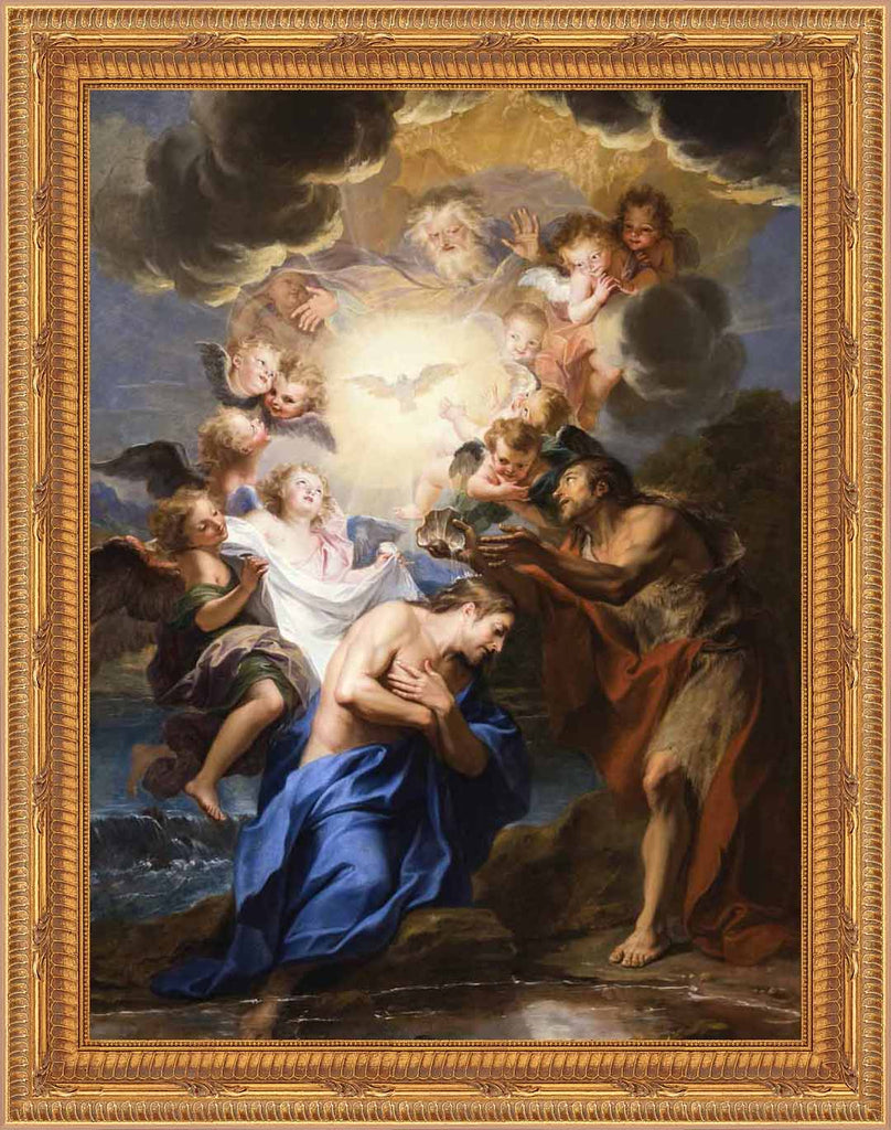 TEX-9264 Beautiful framed image of the Baptism of Christ from the "Textures" collection by Royal Art & Design. What are "Textures"? "Textures" are high resolution images printed in eight colors on fine art paper. The look is a bright, crisp image with a watercolor elegance and a three-dimensional look. Mounted on hardboard and custom framed with a gold colored frame. Frame is 16" X 19", and the image itself varies from 8"-11" x 11"-14" depending on the image. Artist: Antoine Coypel