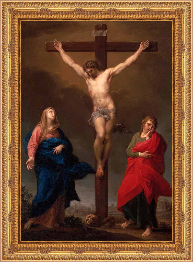 TEX-9093 Beautiful framed image of the Crucifixion from the "Textures" collection by Royal Art & Design. What are "Textures"? "Textures" are high resolution images printed in eight colors on fine art paper. The look is a bright, crisp image with a watercolor elegance and a three-dimensional look. Mounted on hardboard and custom framed with a gold colored frame. Frame is 16" X 19", and the image itself varies from 8"-11" x 11"-14" depending on the image. Artist: Pompeo Batoni