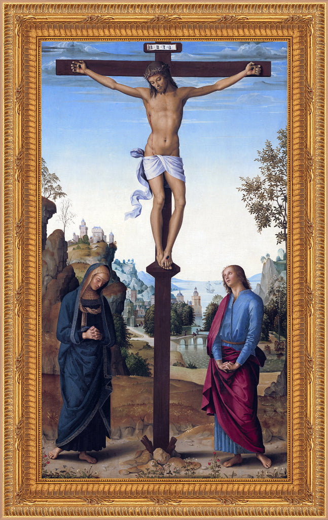 TEX-91106 Beautiful framed image of the Crucifixion from the "Textures" collection by Royal Art & Design. What are "Textures"? "Textures" are high resolution images printed in eight colors on fine art paper. The look is a bright, crisp image with a watercolor elegance and a three-dimensional look. Mounted on hardboard and custom framed with a gold colored frame. Frame is 16" X 19", and the image itself varies from 8"-11" x 11"-14" depending on the image. Artist: Pietro Perugino