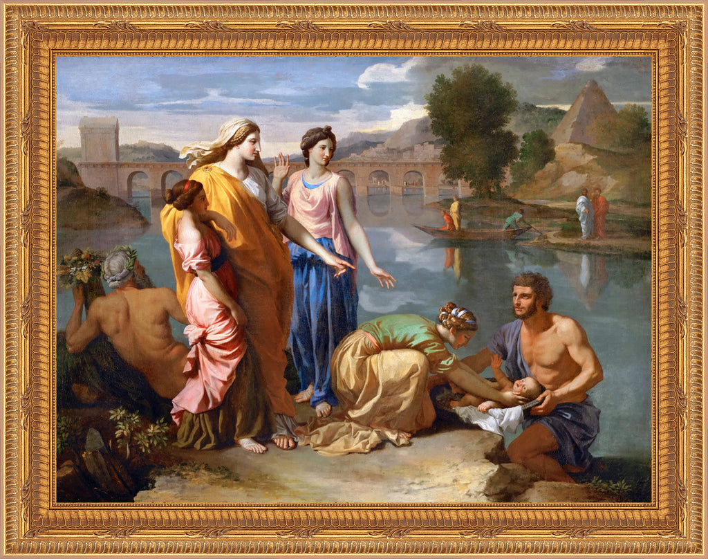TEX-9608 Beautiful framed image of the Finding of Moses from the "Textures" collection by Royal Art & Design. What are "Textures"? "Textures" are high resolution images printed in eight colors on fine art paper. The look is a bright, crisp image with a watercolor elegance and a three-dimensional look. Mounted on hardboard and custom framed with a gold colored frame. Frame is 16" X 19", and the image itself varies from 8"-11" x 11"-14" depending on the image. Artist: Nicolas Poussin