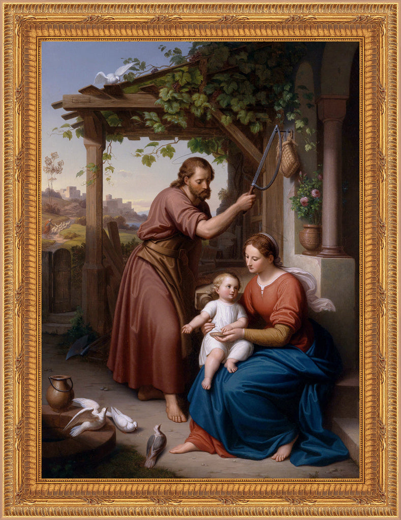 TEX-91083 Beautiful framed image of the Holy Family from the "Textures" collection by Royal Art & Design. What are "Textures"? "Textures" are high resolution images printed in eight colors on fine art paper. The look is a bright, crisp image with a watercolor elegance and a three-dimensional look. Mounted on hardboard and custom framed with a gold colored frame. Frame is 16" X 19", and the image itself varies from 8"-11" x 11"-14" depending on the image. Artist: Julius Frank