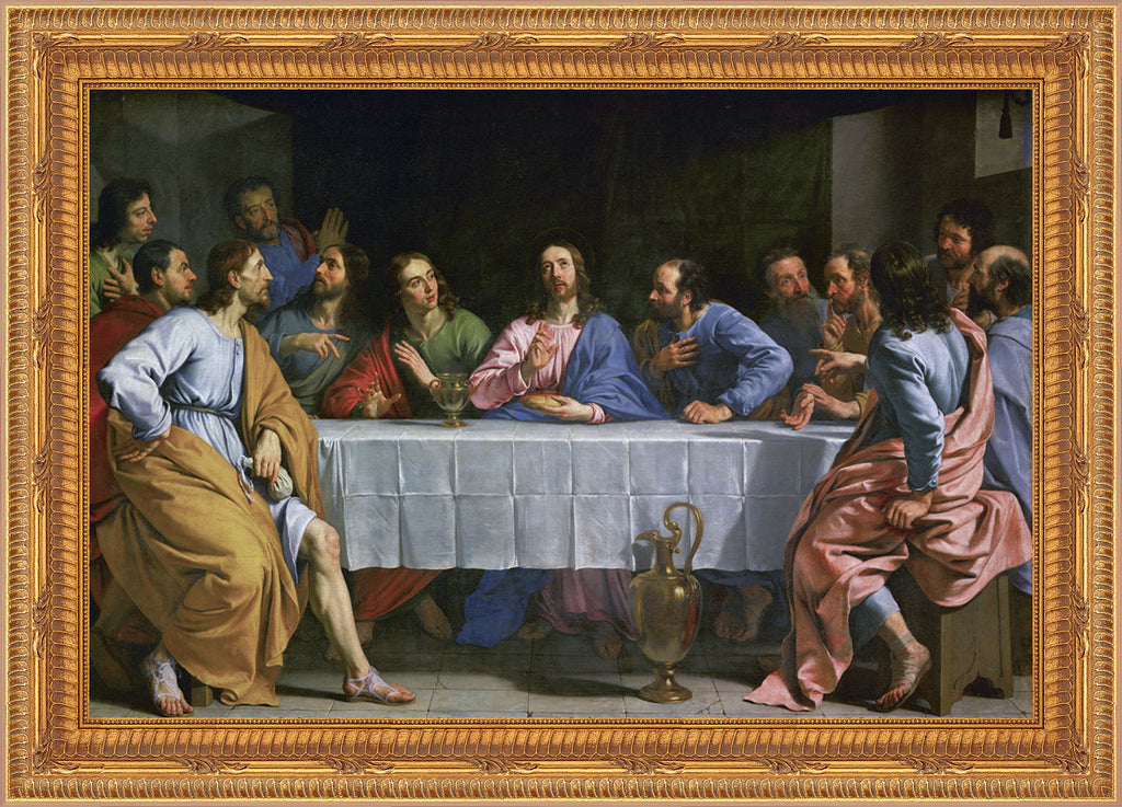 TEX-9094 Beautiful framed image of the Last Supper from the "Textures" collection by Royal Art & Design. What are "Textures"? "Textures" are high resolution images printed in eight colors on fine art paper. The look is a bright, crisp image with a watercolor elegance and a three-dimensional look. Mounted on hardboard and custom framed with a gold colored frame. Frame is 16" X 19", and the image itself varies from 8"-11" x 11"-14" depending on the image. Artist: Philippe de Champaigne