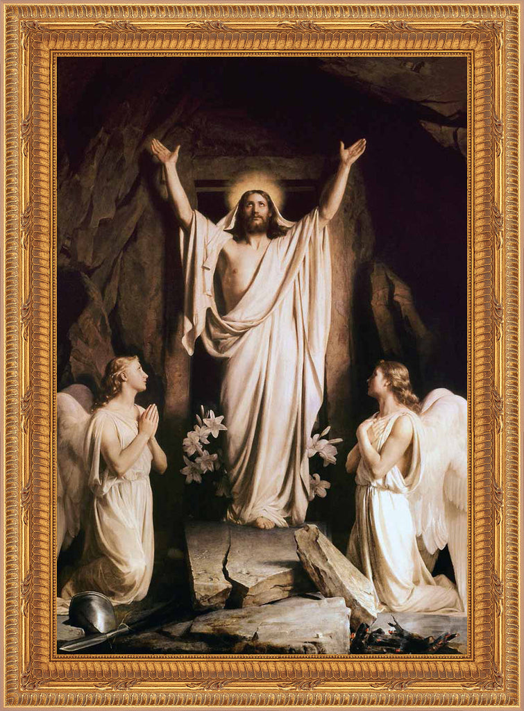 TEX-9115 Beautiful framed image of the Resurrection from the "Textures" collection by Royal Art & Design. What are "Textures"? "Textures" are high resolution images printed in eight colors on fine art paper. The look is a bright, crisp image with a watercolor elegance and a three-dimensional look. Mounted on hardboard and custom framed with a gold colored frame. Frame is 16" X 19", and the image itself varies from 8"-11" x 11"-14" depending on the image. Artist: Carl Heinrich Bloch