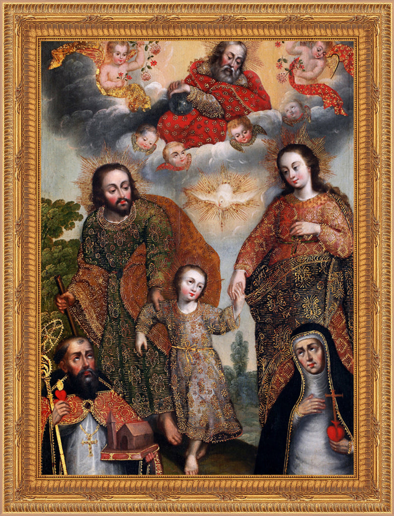 TEX-9929 Beautiful framed image of the Two Trinities from the "Textures" collection by Royal Art & Design. What are "Textures"? "Textures" are high resolution images printed in eight colors on fine art paper. The look is a bright, crisp image with a watercolor elegance and a three-dimensional look. Mounted on hardboard and custom framed with a gold colored frame. Frame is 16" X 19", and the image itself varies from 8"-11" x 11"-14" depending on the image. Artist: Cuzco school
