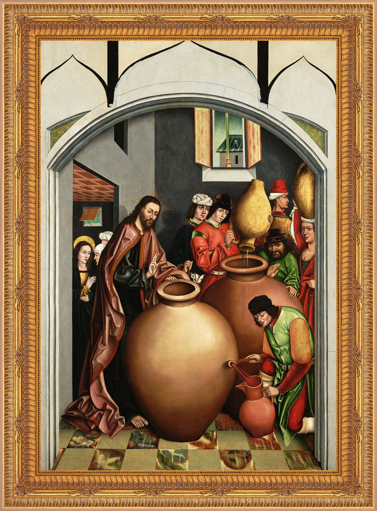 TEX-9869 Beautiful framed image of the Wedding at Cana from the "Textures" collection by Royal Art & Design. What are "Textures"? "Textures" are high resolution images printed in eight colors on fine art paper. The look is a bright, crisp image with a watercolor elegance and a three-dimensional look. Mounted on hardboard and custom framed with a gold colored frame. Frame is 16" X 19", and the image itself varies from 8"-11" x 11"-14" depending on the image. Artist: Fernando Gallego