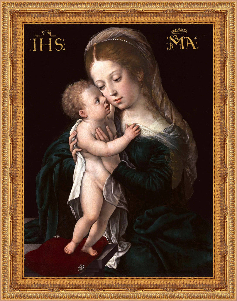 TEX-91405 Beautiful framed image of the Virgin and Child from the "Textures" collection by Royal Art & Design. What are "Textures"? "Textures" are high resolution images printed in eight colors on fine art paper. The look is a bright, crisp image with a watercolor elegance and a three-dimensional look. Mounted on hardboard and custom framed with a gold colored frame. Frame is 16" X 19", and the image itself varies from 8"-11" x 11"-14" depending on the image. Artist: Bernard van Orley