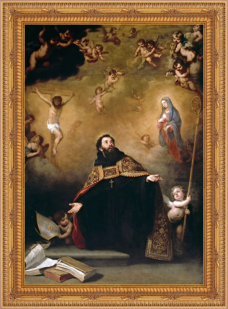 TEX-9192 Beautiful framed image of the Vision of St Augustine from the "Textures" collection by Royal Art & Design. What are "Textures"? "Textures" are high resolution images printed in eight colors on fine art paper. The look is a bright, crisp image with a watercolor elegance and a three-dimensional look. Mounted on hardboard and custom framed with a gold colored frame. Frame is 16" X 19", and the image itself varies from 8"-11" x 11"-14" depending on the image. Artist: Bartolomeo Esteban Murillo