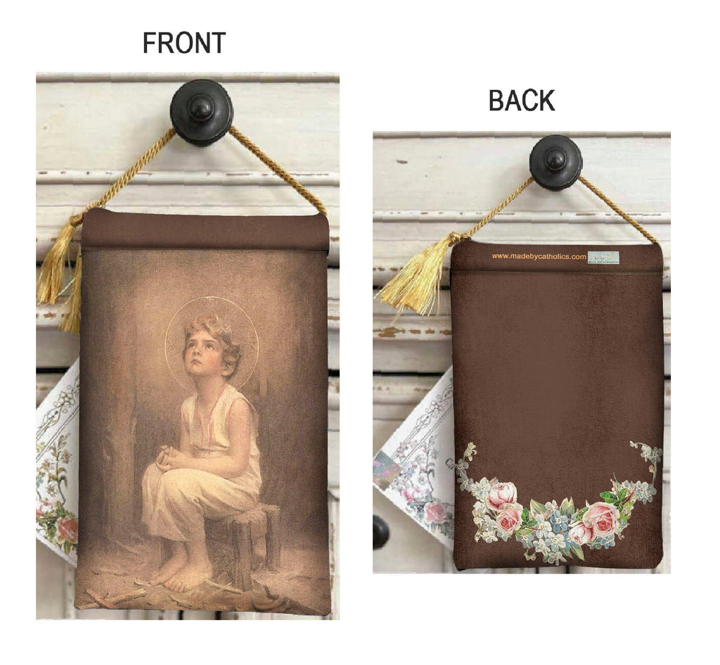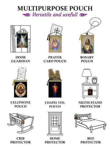 VJ This beautiful, double sided protector pouch in The Child Jesus design is useful for many purposes. You can use to carry your veil, rosary, phone or use to package a gift. You could could also hang on a door or baby's crib. Made in Mexico and the USA by Christians. Material: Soft resistant velvet. Size: 9in. x 5in.